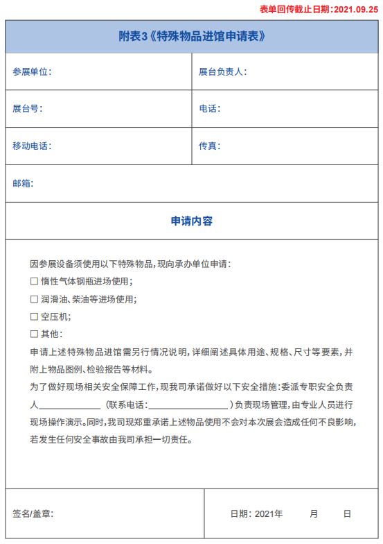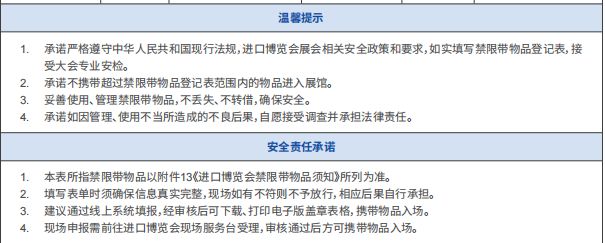 1) 進博會特殊物品泛指空壓機、潤滑油、柴油等丙類油品、惰性氣體、助燃或可燃氣體等。進博會參展商須嚴格按照要求填寫、辦理特殊物品進館申請表,確保信息完整、準確,獲承辦單位書面批準后方可帶入展館內(nèi),同時做好特殊物品進館后的現(xiàn)場安全管理工作。具體請詳見附表3:《特殊物品進館申請表》。