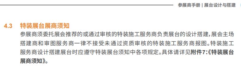 同時,進博會特裝展臺設計搭建第4.2條也有明確說明:“為全面加強展會特裝展臺的安全生產(chǎn)管理工作,確保展臺搭建、拆除及展期維護嚴格遵守推薦特裝施工服務商承辦單位及展館的相關安全生產(chǎn)的規(guī)定與要求,承辦單位特別推薦了多家資質(zhì)良好、經(jīng)驗豐富、管理嚴格的特裝施工服務商,以供展商自行選用”